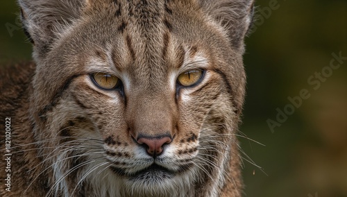 © Future Vision, Fototapeta premium Staring lynx-like wild cat filling frame in woodland, showing amber eyes and long whiskers