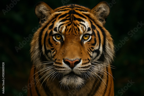 © Koushik, Fototapeta premium Staring majestic tiger face with golden eyes captured in wild habitat for international tiger day to reflect strength wilderness focus and raw natural power