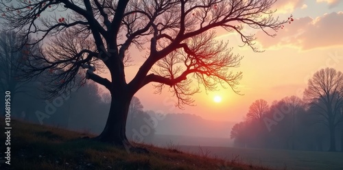 © Febz, Fototapeta premium Stark branches, pale bark, soft evening light Early spring oak silhouette , bare, March, outdoor
