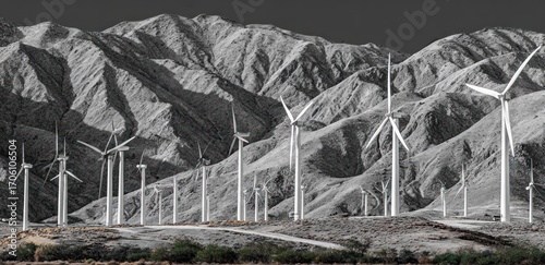 Fototapeta premium Stark monochrome image of wind turbines standing before a stark, craggy...