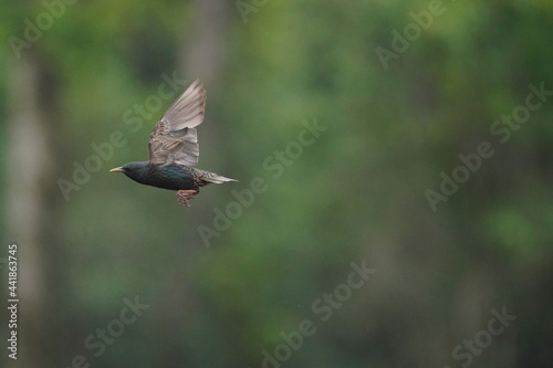 © Janet, Fototapeta premium Starling flying in woods in summer evening
