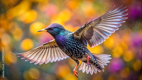 Obraz premium Starling Flying with Spread Wings and Colorful Blurred Background