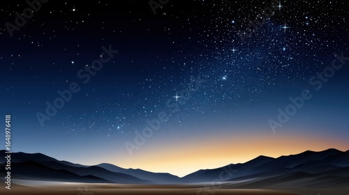 © Vangly, Fototapeta premium Starlit desert landscape at twilight with distant mountains and a gradient sky.
