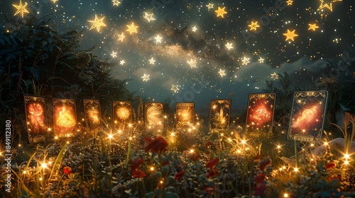 Naklejka premium Starlit Gypsy Tarot Meadow Under Twinkling Night Sky