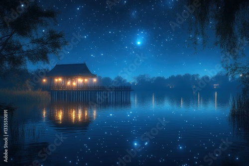 © Yeti, Fototapeta premium Starlit Lakeside Pavilion at Night