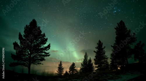 © Vivi, Fototapeta premium Starlit northern lights scene, soft cinematic glow,