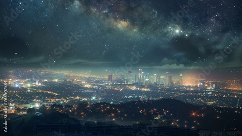 © laliz, Obraz premium Starry Cityscape AweInspiring Night View from Hilltop with Glittering Galaxy and Urban Lights Below