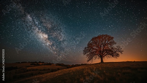 Fototapeta premium Starry Milky Way shining above a tree on a gentle incline, with sunrise...