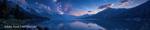 Fototapeta premium Starry mountainside with a calm lake and forest, peaceful, landscape