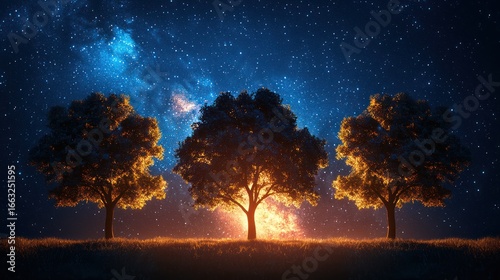 Naklejka premium Starry night, illuminated trees, field, nature, serene scene, digital art, for desktop background, wallpaper, poster design