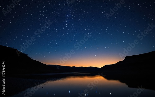 Naklejka premium Starry Night Lake Serenity: Mountains Reflecting Celestial Beauty