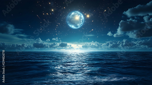 © muhaimin, Fototapeta premium Starry night moonlit ocean view