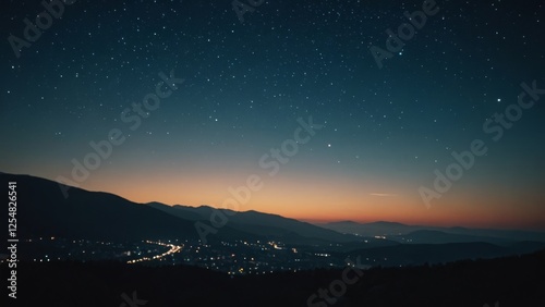 Fototapeta premium Starry night over a mountain town with a glowing horizon and serene landscape