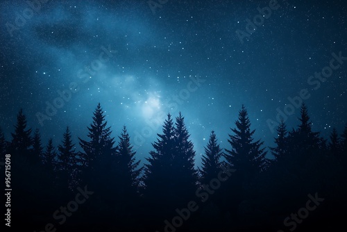 Naklejka premium Starry Night Over Coniferous Forest, Celestial Serenity Under Moonlit Sky