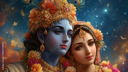 Fototapeta premium Starry‑night reverie – Radha resting on Krishna’s shoulder, celestial love...