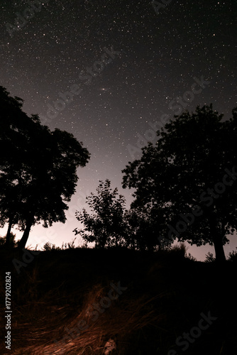 © Владислав Легір, Fototapeta premium Starry night sky above dark forest trees under clear summer night with natural moonlight and peaceful wilderness atmosphere