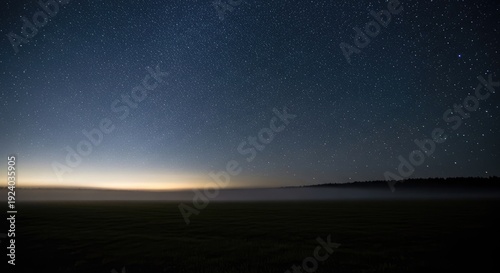 © Yohanessoekamti, Fototapeta premium Starry-night-sky-during-twilight-over-serene-horizon-with-milky-way-galaxy-and-diffused-earthlight-reflection-on-mist-covered-landscape