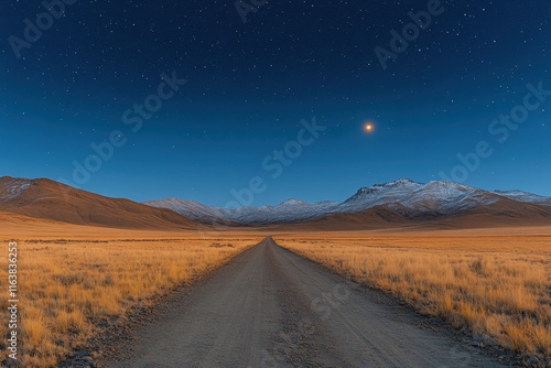 © AgungRikhi, Fototapeta premium Starry night sky over a long, empty dirt road leading towards snow-capped mountains in a vast, dry plain.