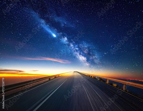 © Andi, Fototapeta premium Starry night sky over a road leading toward sunset