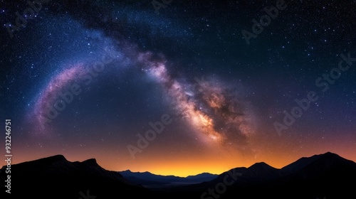 © olegganko, Fototapeta premium Starry night sky over calm lake surrounded by mountain ranges at twilight