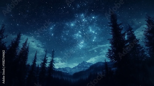 Naklejka premium Starry Night Sky Over Majestic Mountain Landscape