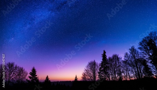© Oscar, Fototapeta premium Starry Night Sky Over Silhouetted Trees With A Gradient Of Blue And Purple Hues