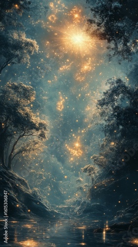 © Optimax Image, Fototapeta premium Starry Night Sky Reflecting on River with Trees Silhouette