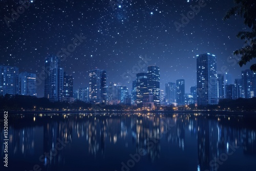 © Npicture, Naklejka premium Starry Night Sky Reflects City Buildings Over a Peaceful Lake