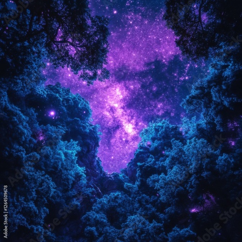 © tanawatbig, Fototapeta premium Starry Night Sky Through Tree Canopy with Cosmic Colors and Light