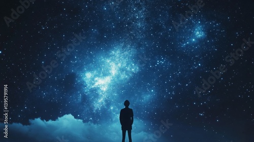 Fototapeta premium Starry night sky viewed by a person standing alone on a cloud with a vast universe above in a serene atmosphere