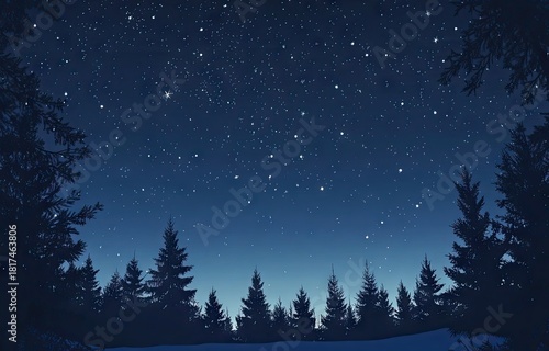 Naklejka premium Starry night sky, winter snow scene with pine trees on the horizon