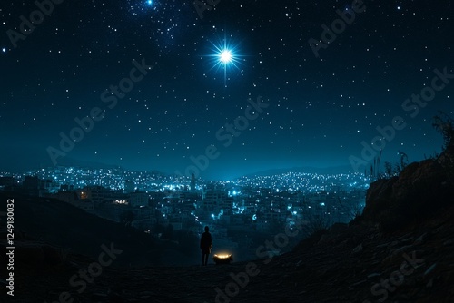 © Andrii Savchuk, Naklejka premium Starry night sky with a glowing galaxy and mountain silhouette