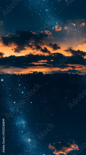 © 淑红 蔡, Fototapeta premium Starry Night Sky with Fiery Clouds and Galactic Stars