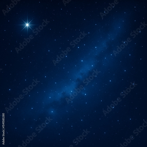 Fototapeta premium Starry night sky with glowing bright star, cosmic deep blue space background, peaceful celestial view ideal for creative and commercial use, unique design Pro.