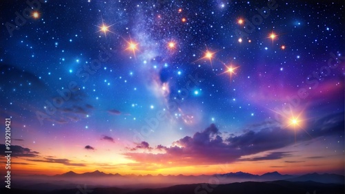 © Olga, Fototapeta premium Starry Night Sky with Glowing Stars Above a Mountainous Horizon