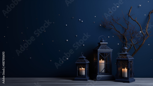 Fototapeta premium Starry Night Theme with Lanterns and Branch on Dark Blue Wall