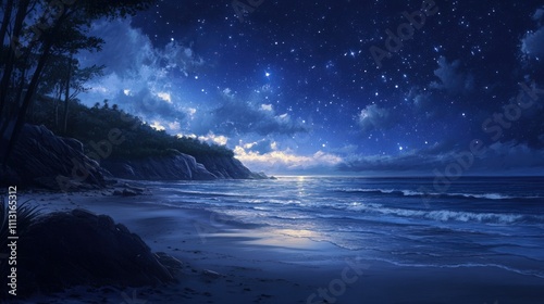 Fototapeta premium Starry night, tranquil beach, dark ocean waves.