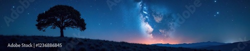Fototapeta premium Starry night with a lone tree and glowing star trails, solitary, glow
