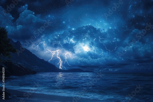 © Roshani, Fototapeta premium Starry night with Thunderstorm. Night thunderstorm with lightning above the sea