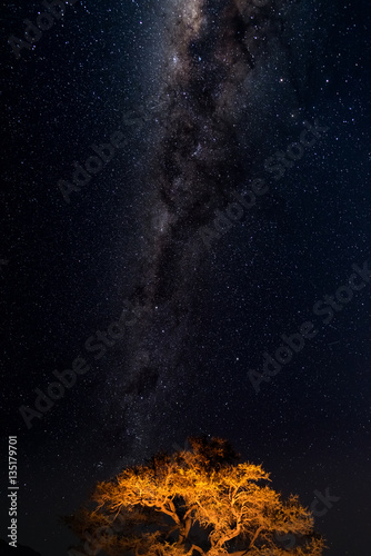 © fabio lamanna, Naklejka premium Starry sky and Milky Way arc, with details of its bright colorful core, captured from green oasis in the Namib desert, Namibia, Africa. Adventures into the wild.