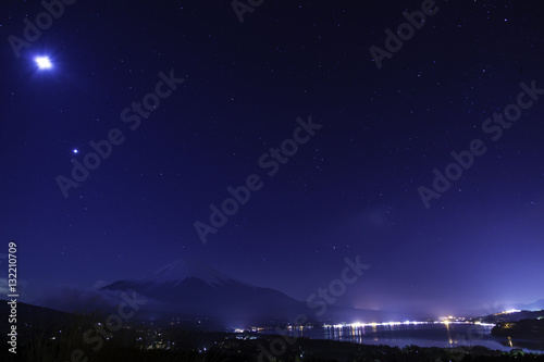 Fototapeta premium Starry Sky and Mount Fuji from Lake Yamanakako observatory