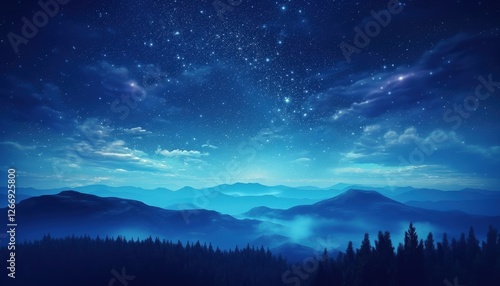 Fototapeta premium Starry sky over misty mountains landscape with forest foreground; for...