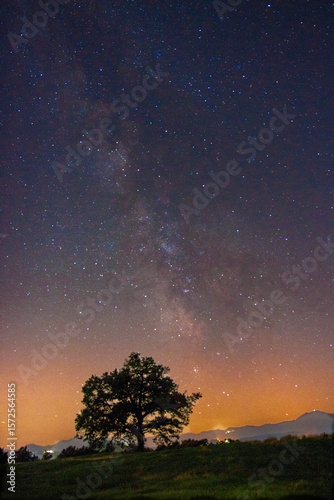 © francescodemarco, Fototapeta premium starry sky with Milky Way in evidence, oak tree and mountains in the distance