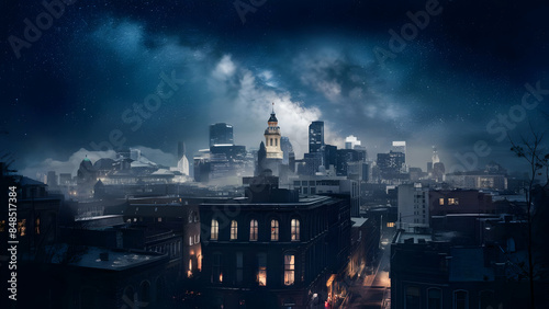 © Matadesain, Fototapeta premium Starry Skyline A Photorealistic Cityscape at Night