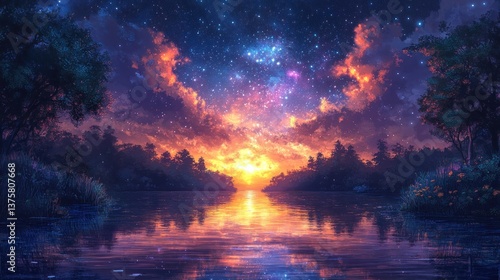 © Mega, Fototapeta premium Starry sunset over a tranquil lake in a forest