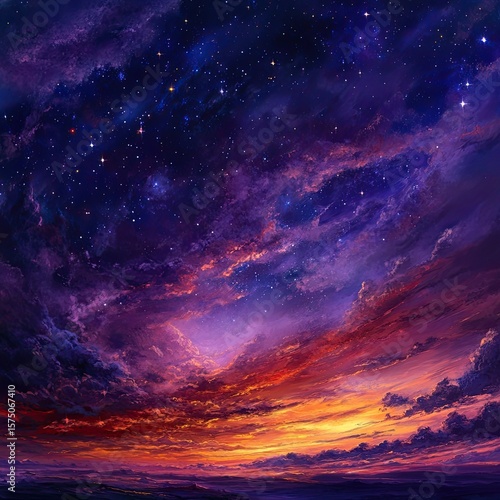 © Hajrah, Fototapeta premium Starry Sunset Sky Above Horizon