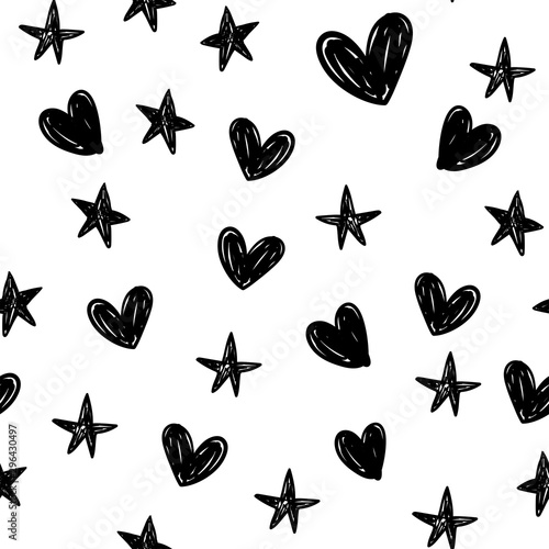 © Matias, Fototapeta premium Stars and hearts doodles seamless pattern. Hand drawn texture background.
