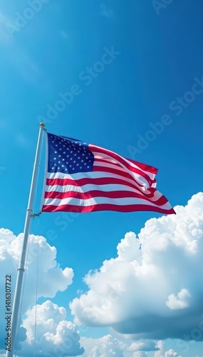 Fototapeta premium Stars and Stripes billow against a vibrant blue sky dotted with fluffy white...