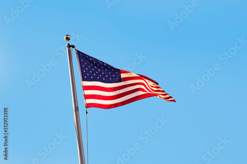 © travelview, Naklejka premium Stars and stripes under clear blue sky
