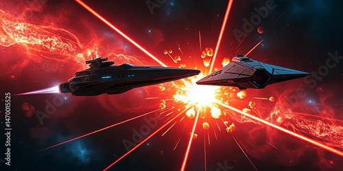 © chanwut, Naklejka premium Starships clash, lasers crisscross, explosions illuminate nebula, beam, galaxy